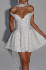 Elevate your ensemble with the Miya Scarf in ivory. Crafted from embellished tulle, it drapes elegantly around the neck, adding a refined touch. Perfectly pairs with the Sapphire Mini Dress for a polished look.