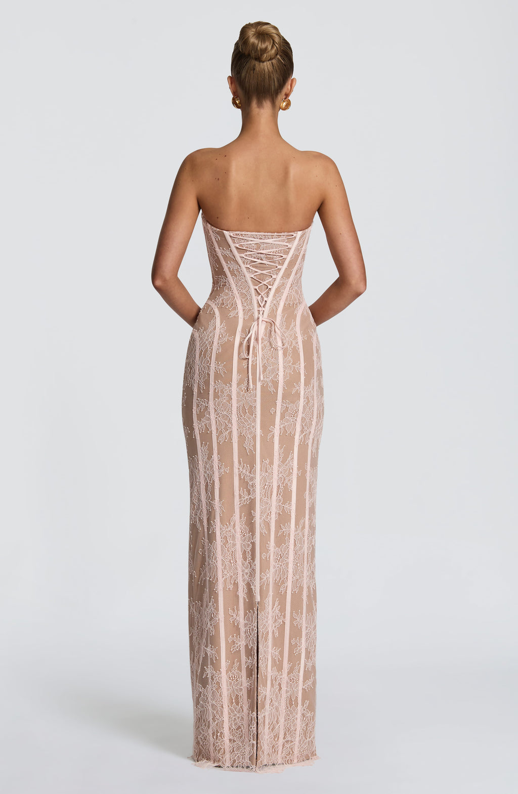 The Sian Maxi Dress in Blush features floral lace with contrast mesh lining and a strapless sweetheart neckline with underwired cups for support. Blush contoured binding shapes the body, while the shaped lace-up back creates a cinched silhouette. The maxi column skirt showcases scalloped lace detailing at the hem and a centre back split for movement.