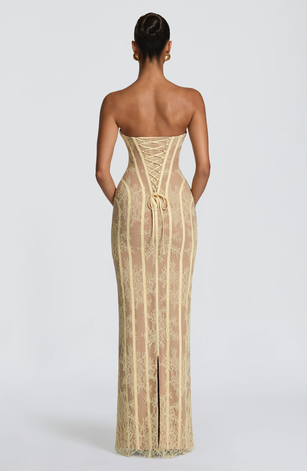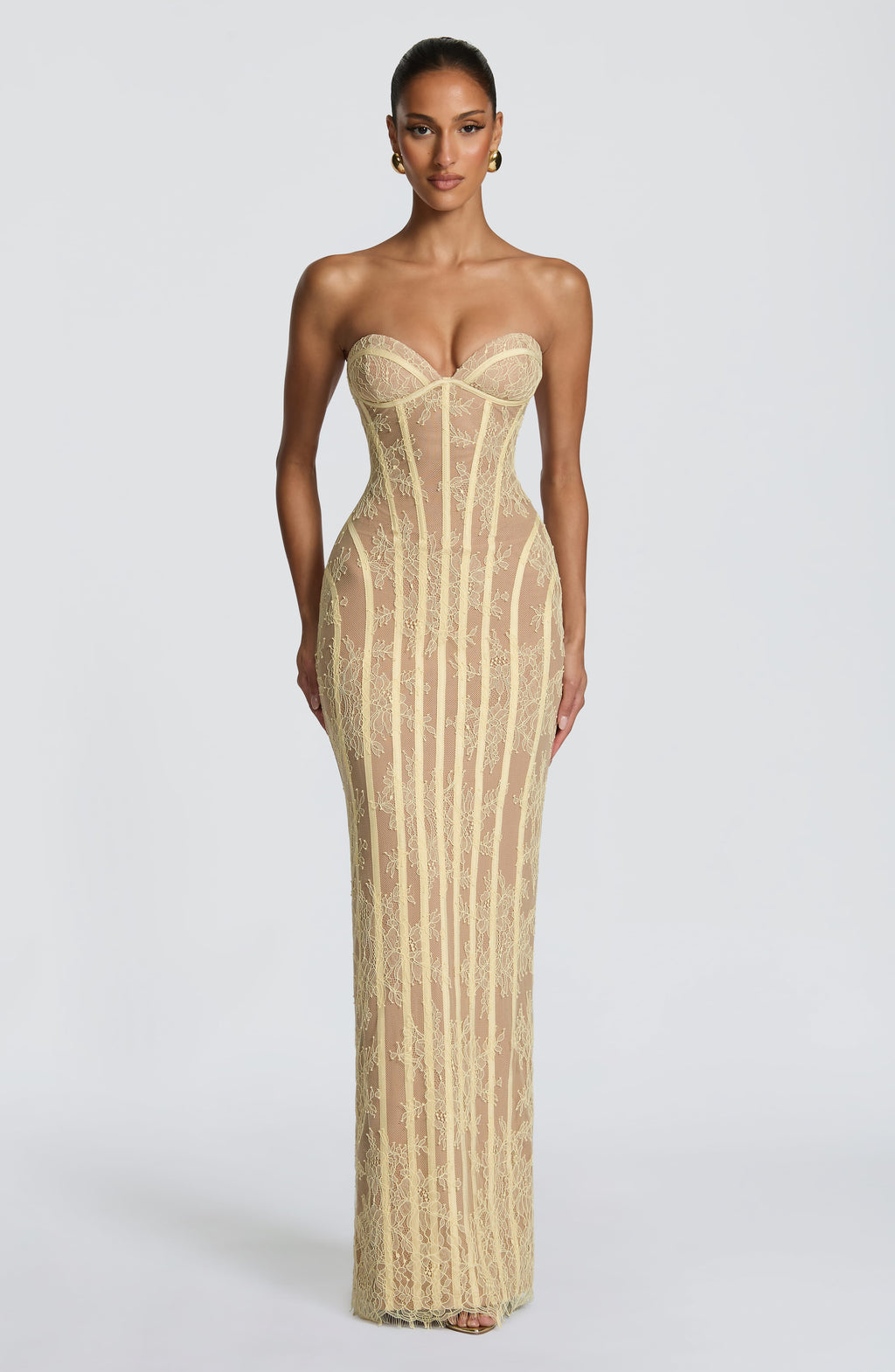 Sian Maxi Dress in Lemon features delicate floral lace with contrast mesh lining and lemon contoured binding that shapes the body. The strapless sweetheart neckline includes underwired cups for support, while the shaped lace-up back creates a cinched silhouette. A maxi column skirt with scalloped lace hem and centre back split completes this piece.