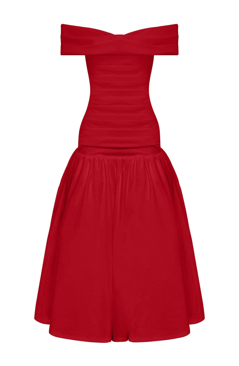 A dreamy dress made for new beginnings, say hello to Wilhelmina. This chic midaxi design features a dropped waist and full skirt, gathered at the seam. The skirt is complemented by a figure-hugging body with pleated bardot neckline to show off your shoulders. Style with strappy heels for your next dinner reservation.