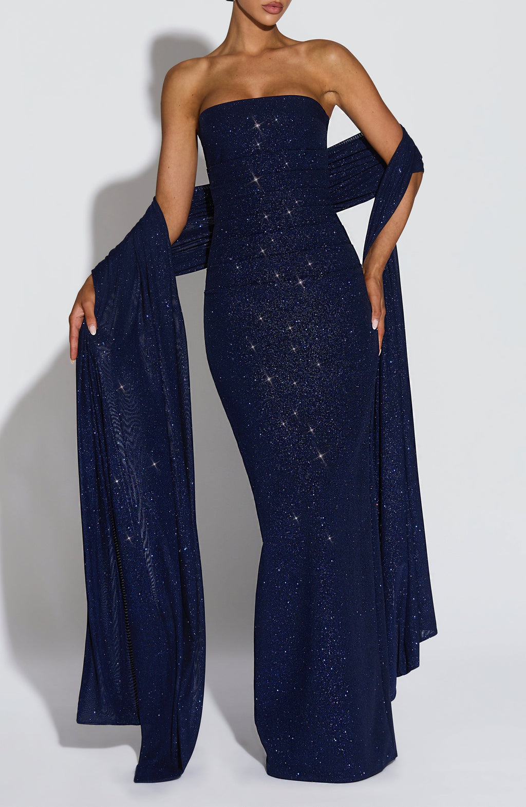 Elevate your ensemble with the Agnes Shawl in Navy Sparkle. Crafted from light stretch mesh accented with subtle glitter, this long shawl drapes elegantly around your arms, adding refined shimmer and graceful sophistication to any look.