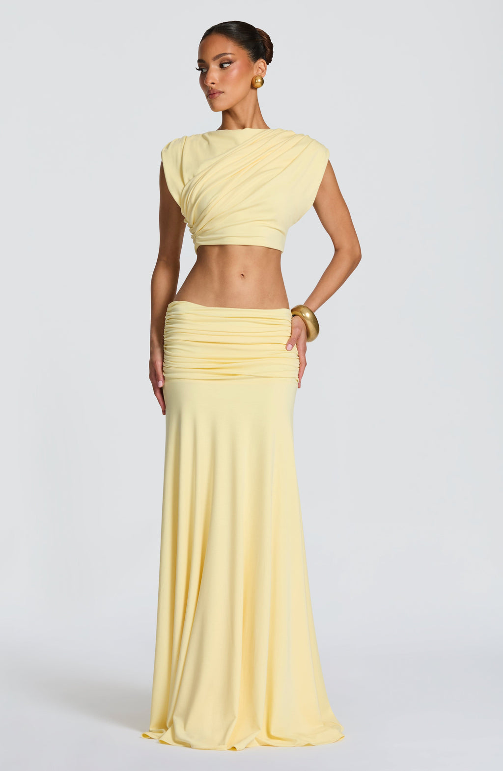 The Amara Top combines understated sophistication with modern design. Crafted in soft modal jersey, this cropped style features a high boat neck, drop shoulders with cap sleeves, and signature gathered draping that sweeps diagonally across the chest and back.