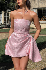 Cut from our luxe jacquard floral fabric with a pretty sheen, Elodie exudes Romance. This playsuit design has internal shorts with a skirt overlay, strapless neckline with asymmetric pleats to the bodice and a playful draped frill cascading from the hip. Dress yours up with sleek waves, a mini clutch and platform heels.