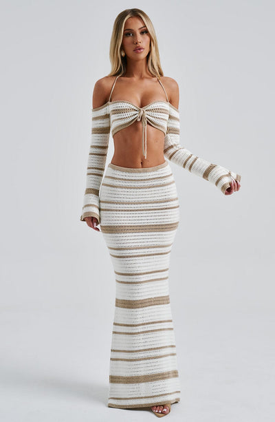 Georgia was made for the sun chasers. A premium crochet knit design with a chic stripe pattern, this iconic piece is off the shoulder, with long flare sleeves and a sweetheart neckline. A halterneck strap can be tied around the neck, while the back is laced up for your perfect fit. Looks amazing worn with the matching Georgia knit skirt, heeled sandals and glowing makeup.