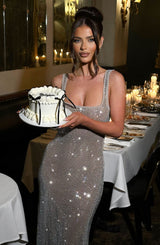 Be the star you are in the Petra dress, a shimmering, sparkling maxi cut from soft stretch net embellished with all-over rhinestones. With a sexy, semi sheer appearance, the dress is complete with a square neckline and low scoop back.