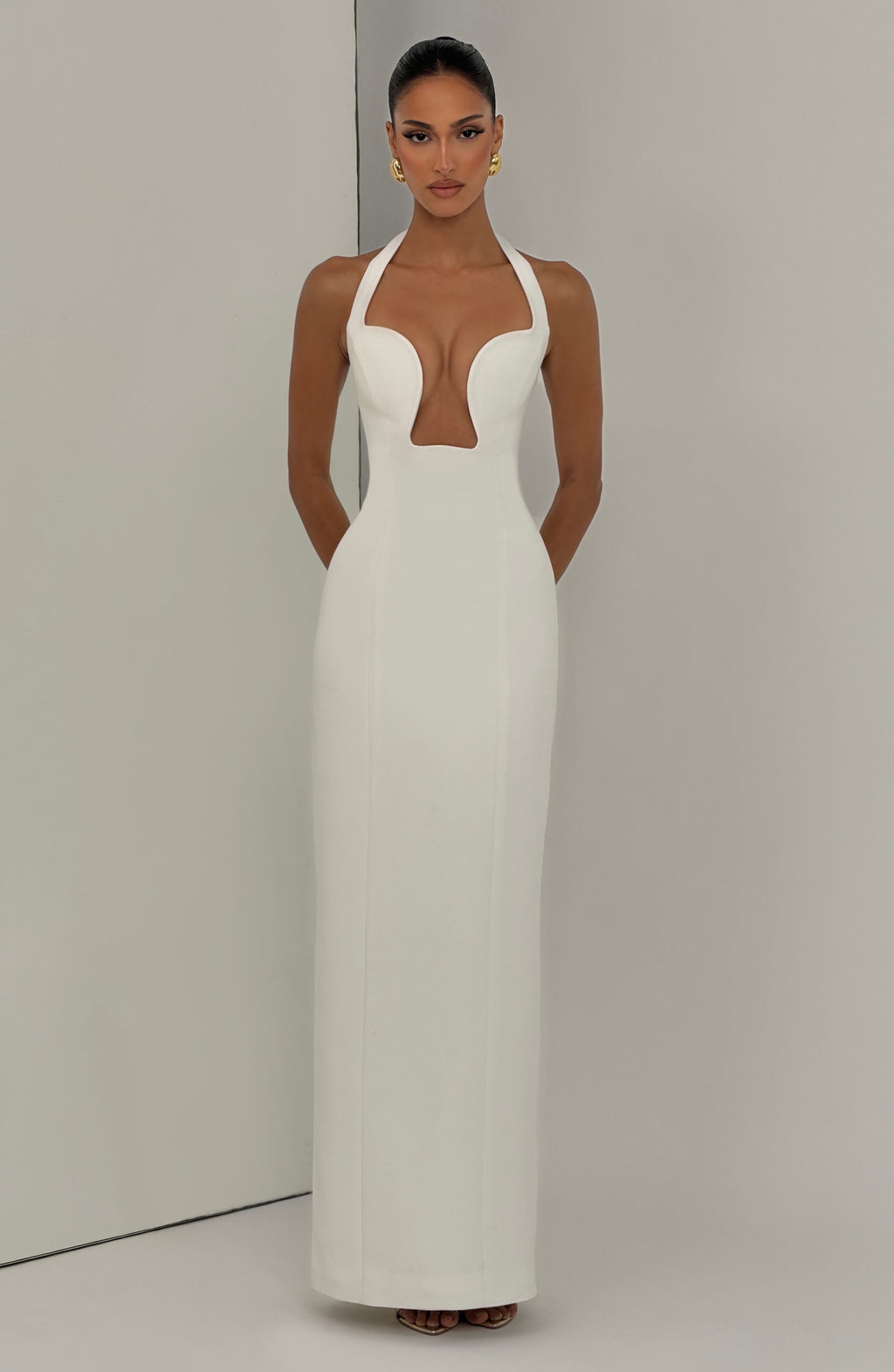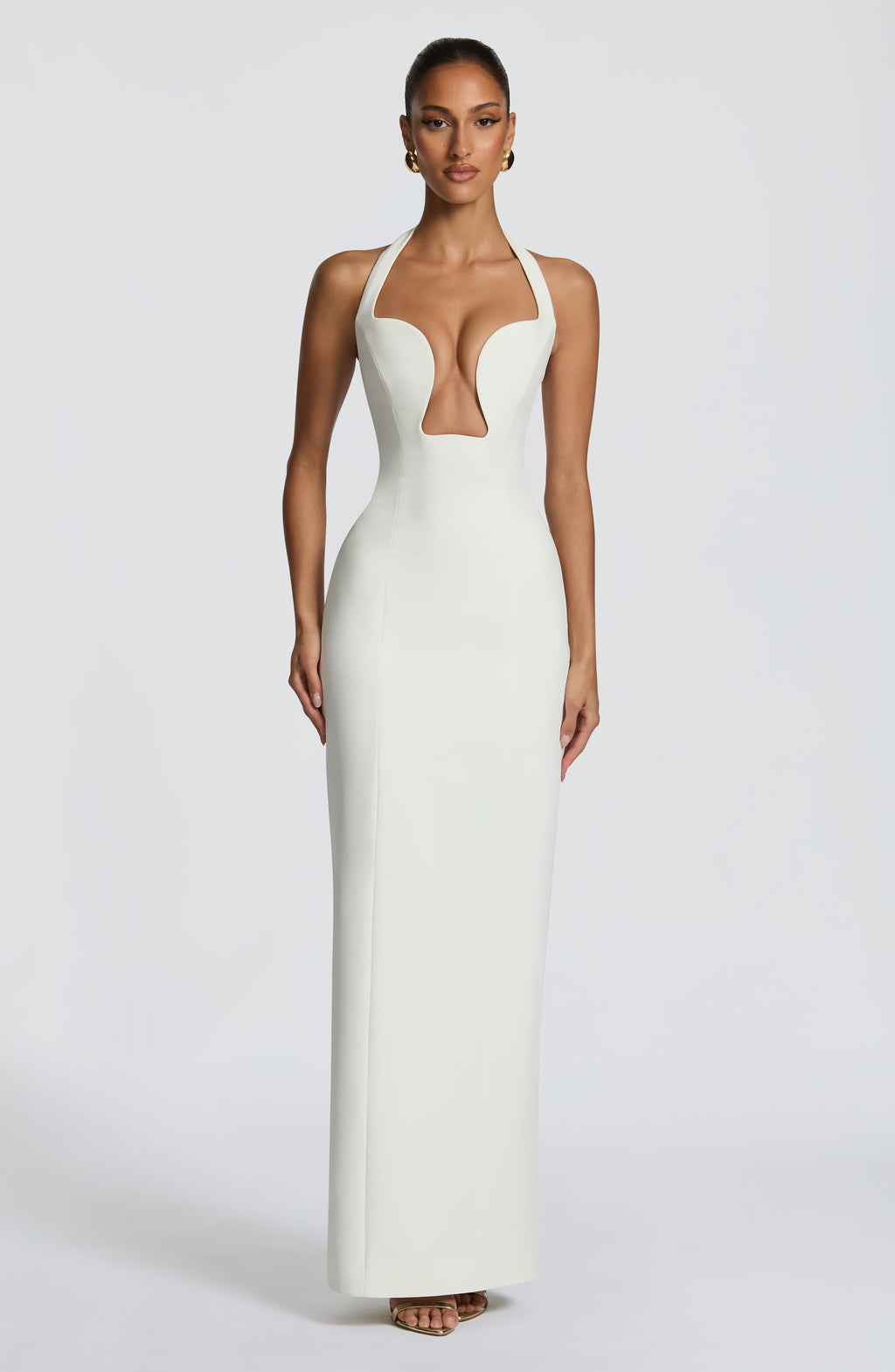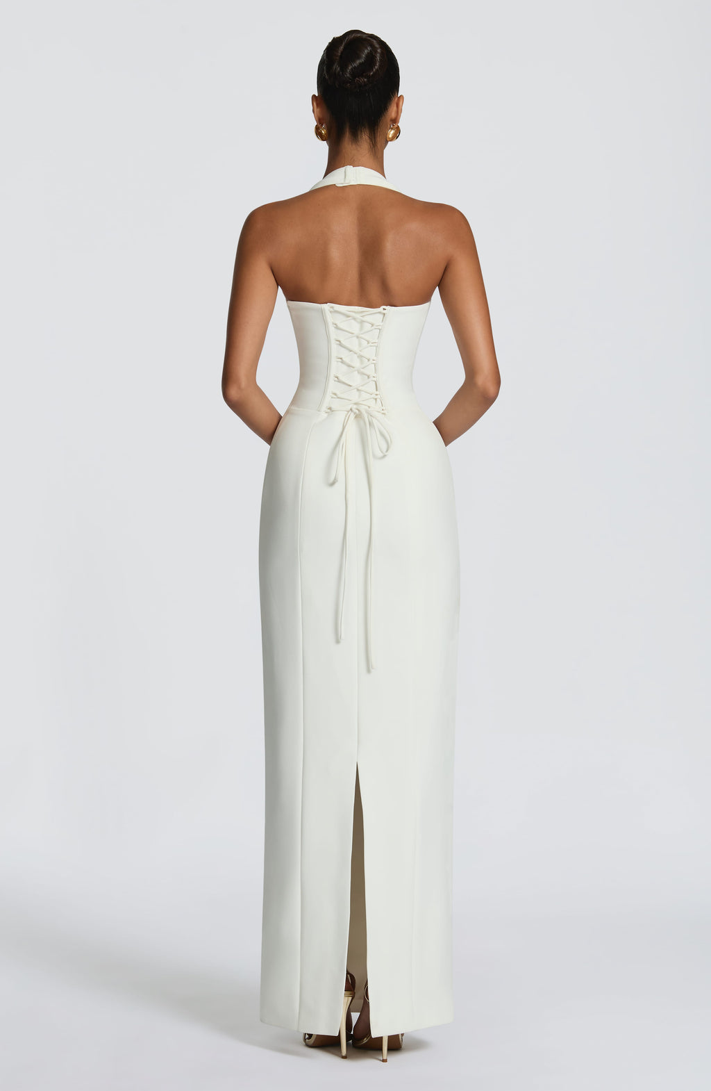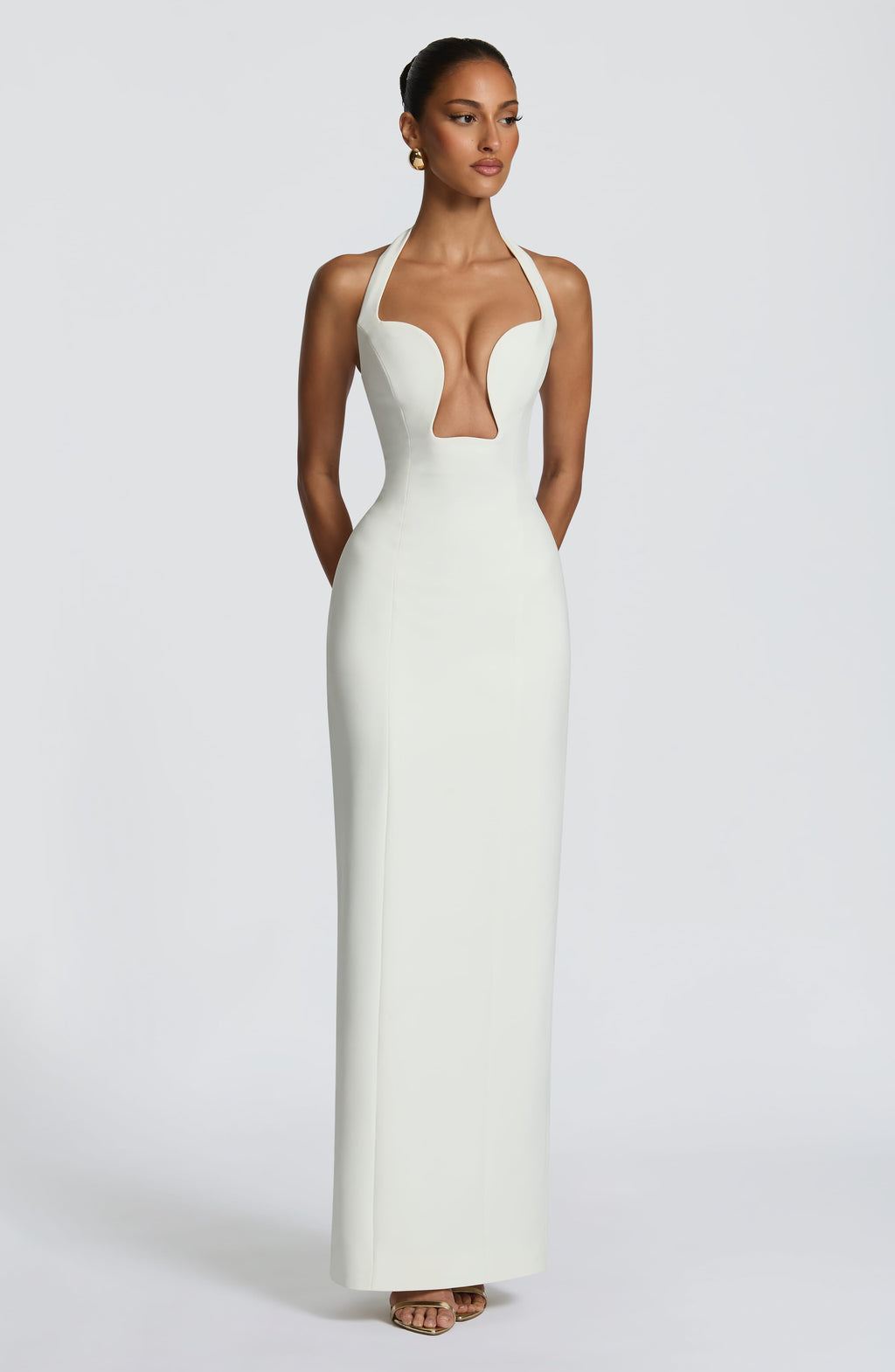 Charlotte Maxi Dress in ivory crepe features a shaped plunge neckline with halter straps and fitted bodice with lace-up back detailing for a cinched silhouette. Column skirt with centre back split. Non-stretch fabric.