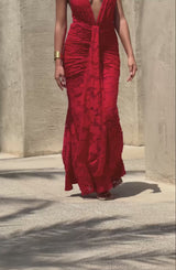 The Guinevere Maxi Dress in red features a custom floral burnout jersey with a deep plunge neckline and halter straps tied dramatically. Its draped front panel and tight ruching at the hips create a flattering fit-and-flare silhouette, perfect for elegant occasions.