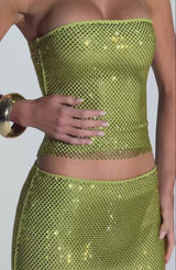The Hali Maxi Skirt in olive features a mid-rise, maxi length design with square hotfix rhinestone embellishments. Fully mesh-lined for comfort, it offers a semi-sheer look and an elastic waistband for a perfect fit.