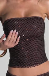 Elevate your wardrobe with the Hali Maxi Skirt in plum brown. Featuring a mid-rise fit and elastic waistband for comfort, this maxi skirt is adorned with square hotfix rhinestones for subtle sparkle. Fully lined in mesh, it offers a semi-sheer, elegant silhouette perfect for refined occasions.
