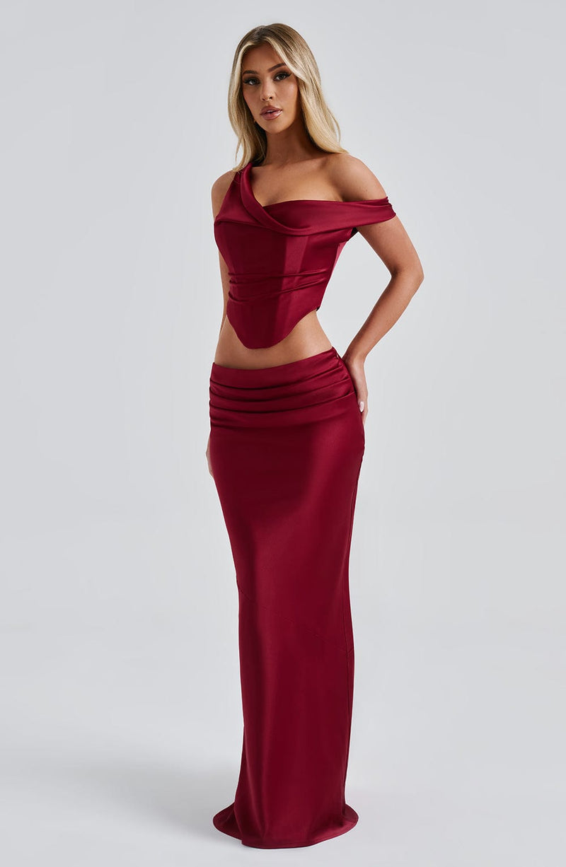 Oh she's luxury! Guaranteed to make you centre of attention, the Bernadette maxi crafted in our premium stretch satin, cut on the bias for a beautiful drape. This one-of-a-kind piece has a pleat detail to the front and diagonal seam at the knee. Pair with the Audra top for a dreamy, luxe look.