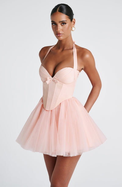 Turn heads in the Keely Mini Dress in Soft Peach - a dreamy blend of elegance and allure. Designed with an underwired, sweetheart neckline and pleated cups, it offers the perfect lift and shape. The halter neck straps tie gracefully at the back, while the lace-up back cinches your waist for a flawless fit. Finished with a full, tulle skirt, Keely delivers fairy-tale vibes with a flirty twist.