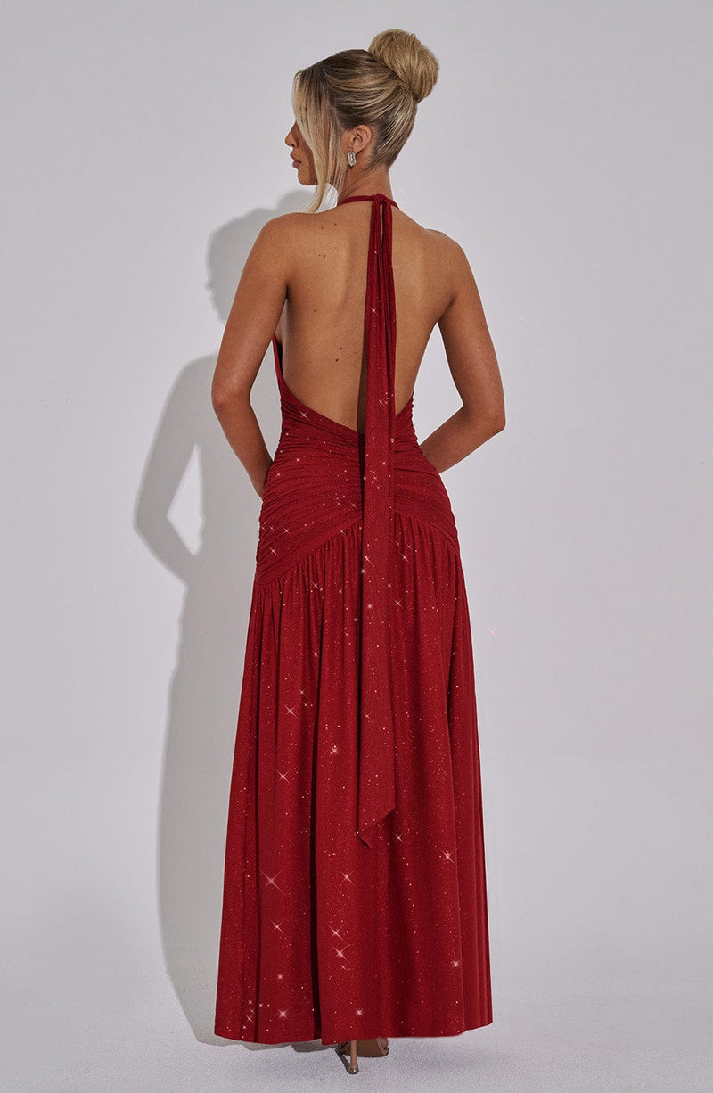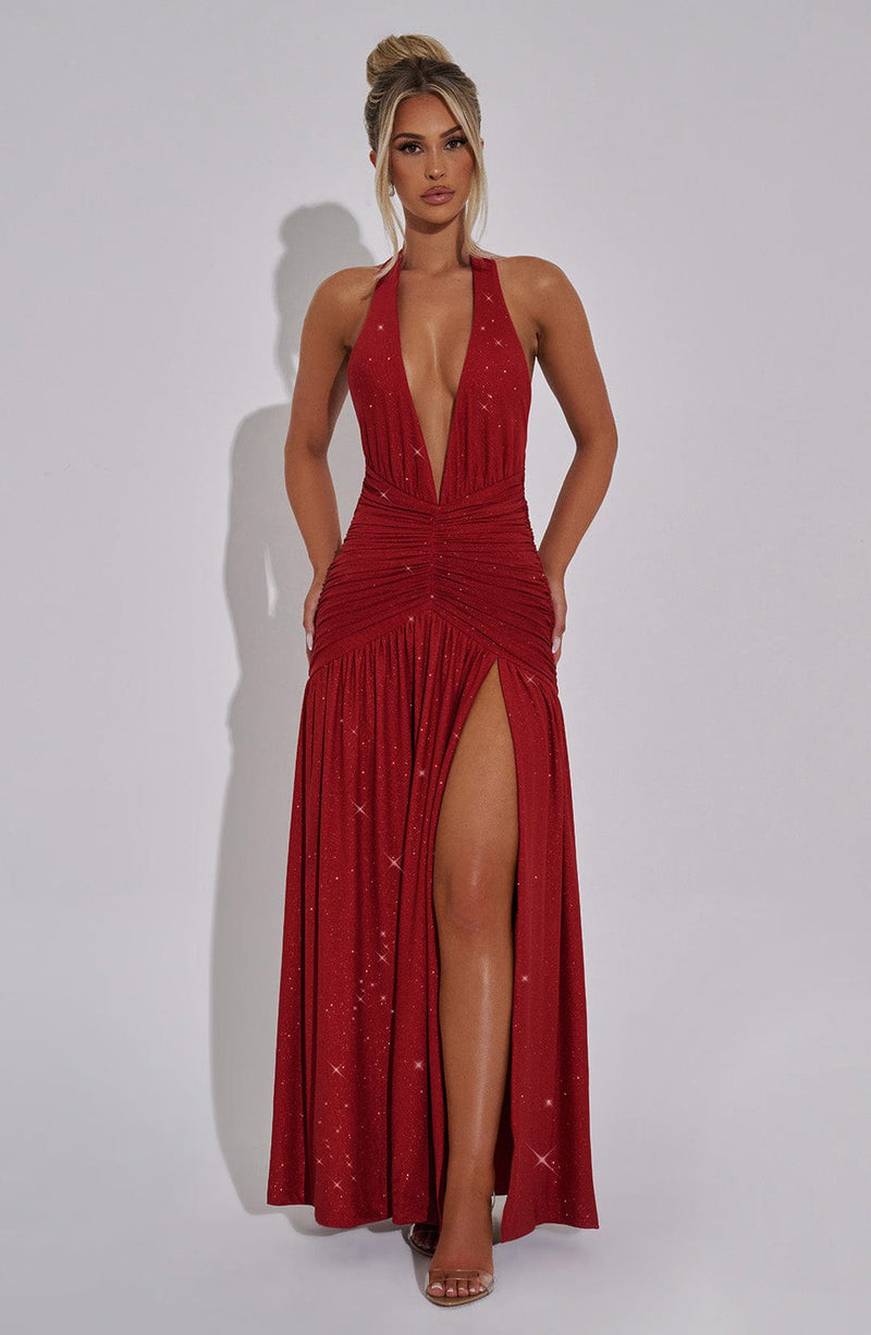 Indulge in pure luxury with our Melania Maxi Dress in Red Sparkle. The sparkly stretch mesh fabric drapes beautifully over your figure, while the plunging halter neckline and low back add an alluring touch. The fitted ruched hips and loose, thigh-high split skirt create a stunning silhouette. Make a statement at your next event with this exclusive maxi dress.