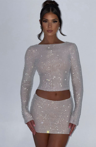 Nude never looked so fabulous! This mini skirt, made with rhinestone stretch mesh fabric, perfectly hugs your figure in all the right places. Match with the Zaya top, Ginni Scarf and heels for party season.
