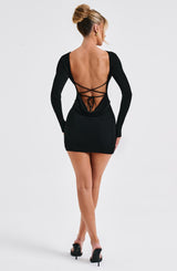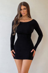 Say hello to the mini of the moment, Una. Crafted in our sleek, high shine fabric that snatches the figure with a second skin fit, this long sleeve design is complete with a high neck and low cowled back with cross over tie detail.