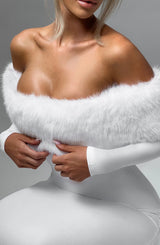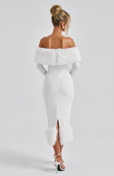 Get ready to turn heads in the Vittoria Midi Dress! Made with premium stretch crepe fabric, this body-hugging dress features a playful Bardot neckline and luxurious faux fur trim. With long sleeves and a pencil skirt, it's perfect for any occasion. Available in elegant ivory, this midi dress is sure to make a statement.