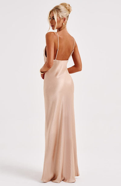 Made in our super luxe, bias cut hammered satin with a gorgeous sheen, the Anja maxi skims the body for a beautiful fit. The perfect dress to create memories in, it features a plunge V-shaped neck and delicate straps.