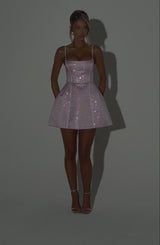 Elevate your style with the Emma Mini Dress in Blush. The structured, non-stretch satin fabric and square neckline exude sophistication, while the hotfix rhinestones add a touch of luxury. The open lace-up back and bubble shaped skirt create a unique silhouette. Perfect for any special occasion.