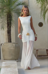 Elevate your ensemble with the Fae Maxi Skirt in pristine white. This sophisticated design features a form-flattering ruched hip detail and slinky jersey upper that transitions into a flowing sheer mesh skirt. The distinctive V-shaped waist and decorative front panel create a slimming silhouette, while the removable orchid brooch adds an elegant finishing touch to this partially lined statement piece. Style with the Ada Top.