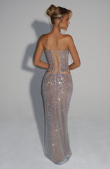 The Hali Maxi Skirt in silver features a low-rise, elastic waistband for comfort and a flattering fit. Embellished with square hotfix rhinestones and fully lined in mesh, it offers a sophisticated semi-sheer look with elegant maxi length.