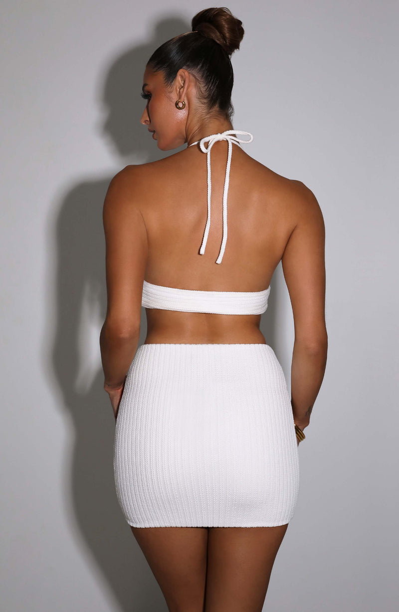 Vacay on the horizon? Make sure you pack Irene, our brand new micro knit mini made with a ruched v waist that can be tightened or loosened for your perfect fit. Match yours with the Irene crop top, loose waves and a summer glow for ultimate vacay vibes.