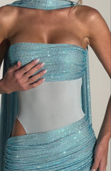 The Kailani Maxi Dress in Aqua features a strapless neckline and elegant maxi length. Crafted from stretch mesh, it showcases a semi-sheer bodice and skirt with ruched and draped panels for refined texture. Hotfix rhinestones add subtle sparkle, perfect for sophisticated occasions.