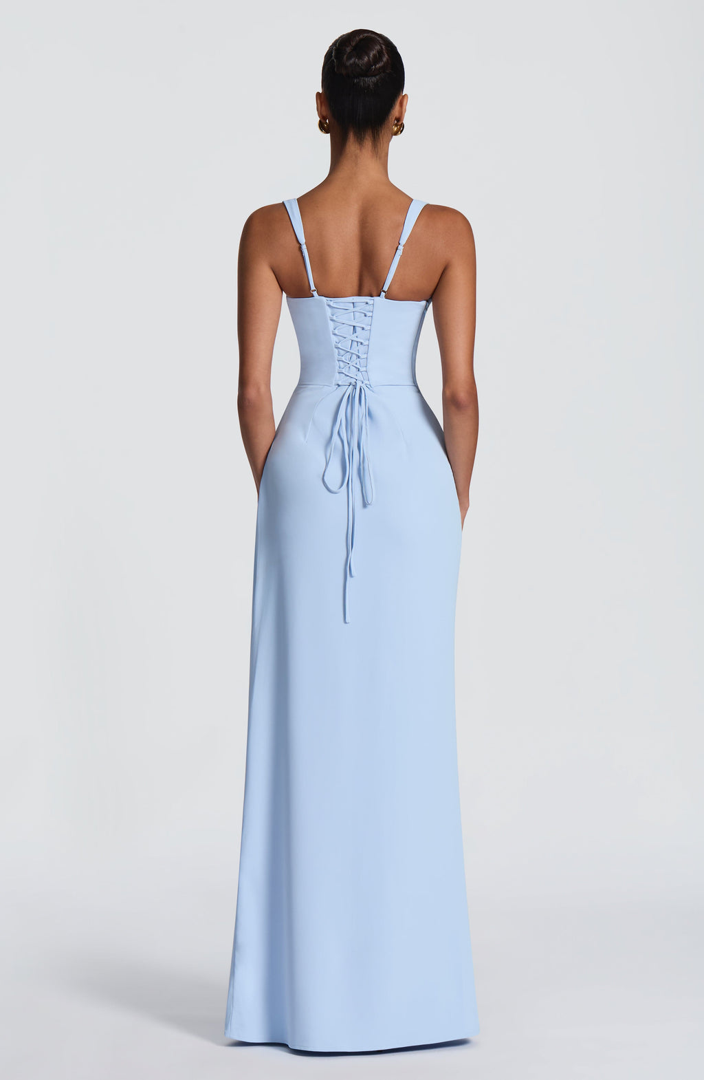 Laleh Maxi Dress in Glacier Blue. Crafted from drape twill with a scooped square neckline and directional pleating on the bodice. Features an internal corset with boning and lace-up back for a cinched silhouette, maxi length, and wrap detail skirt with thigh-high split.