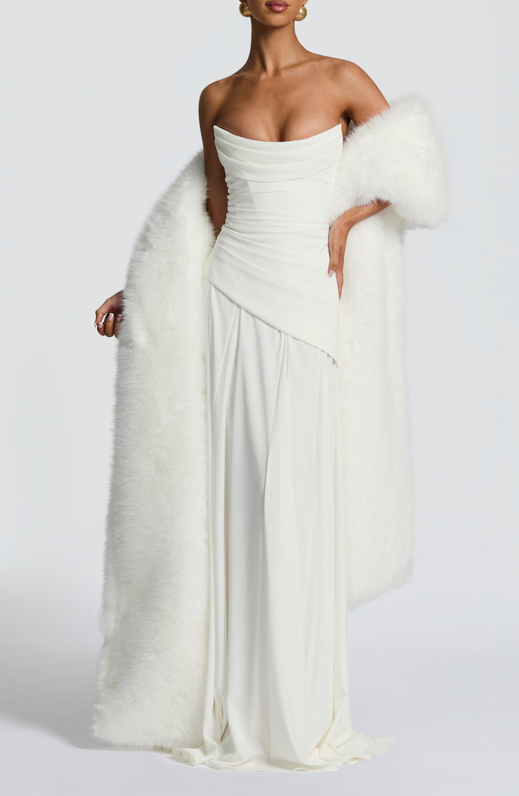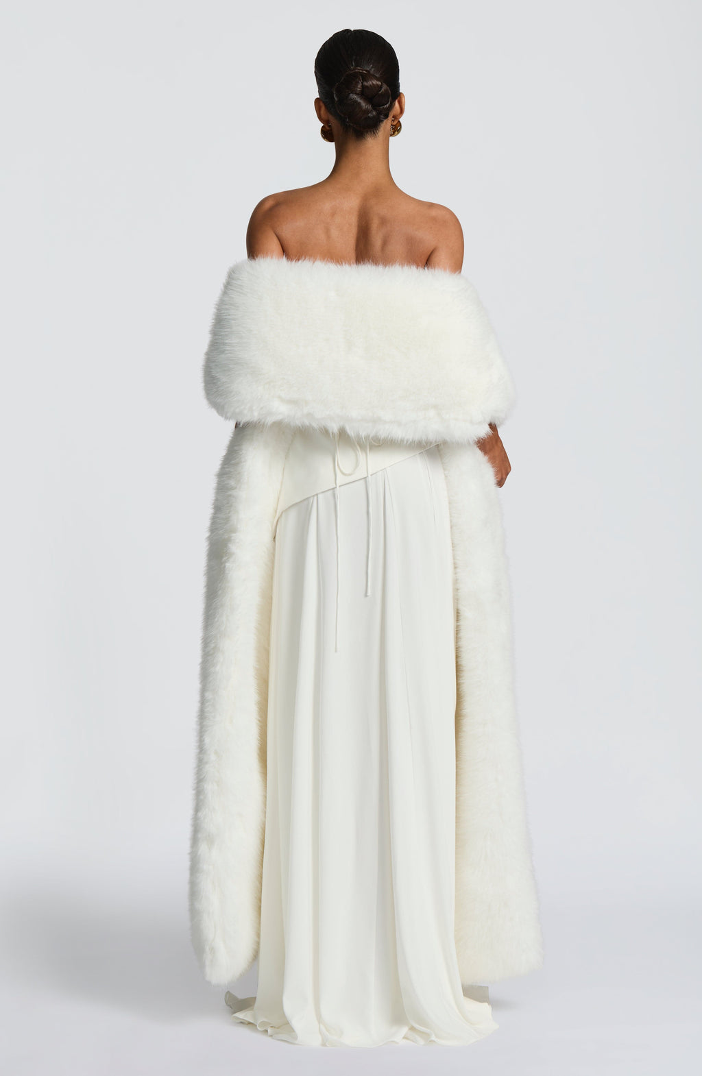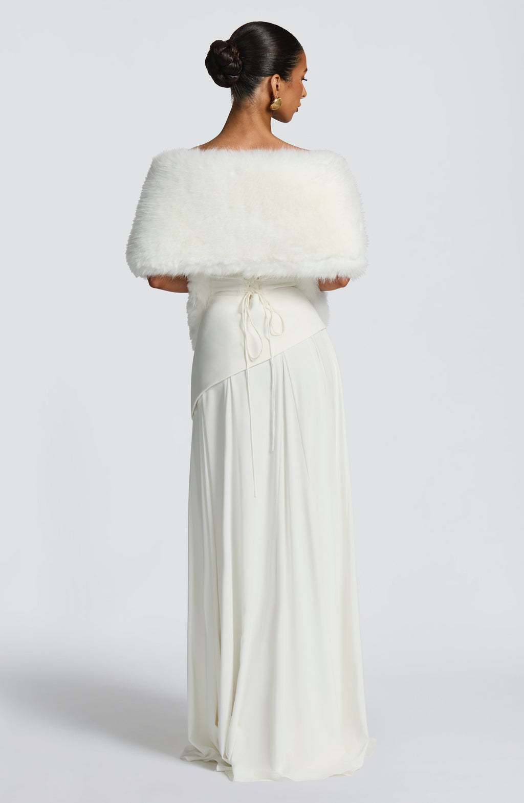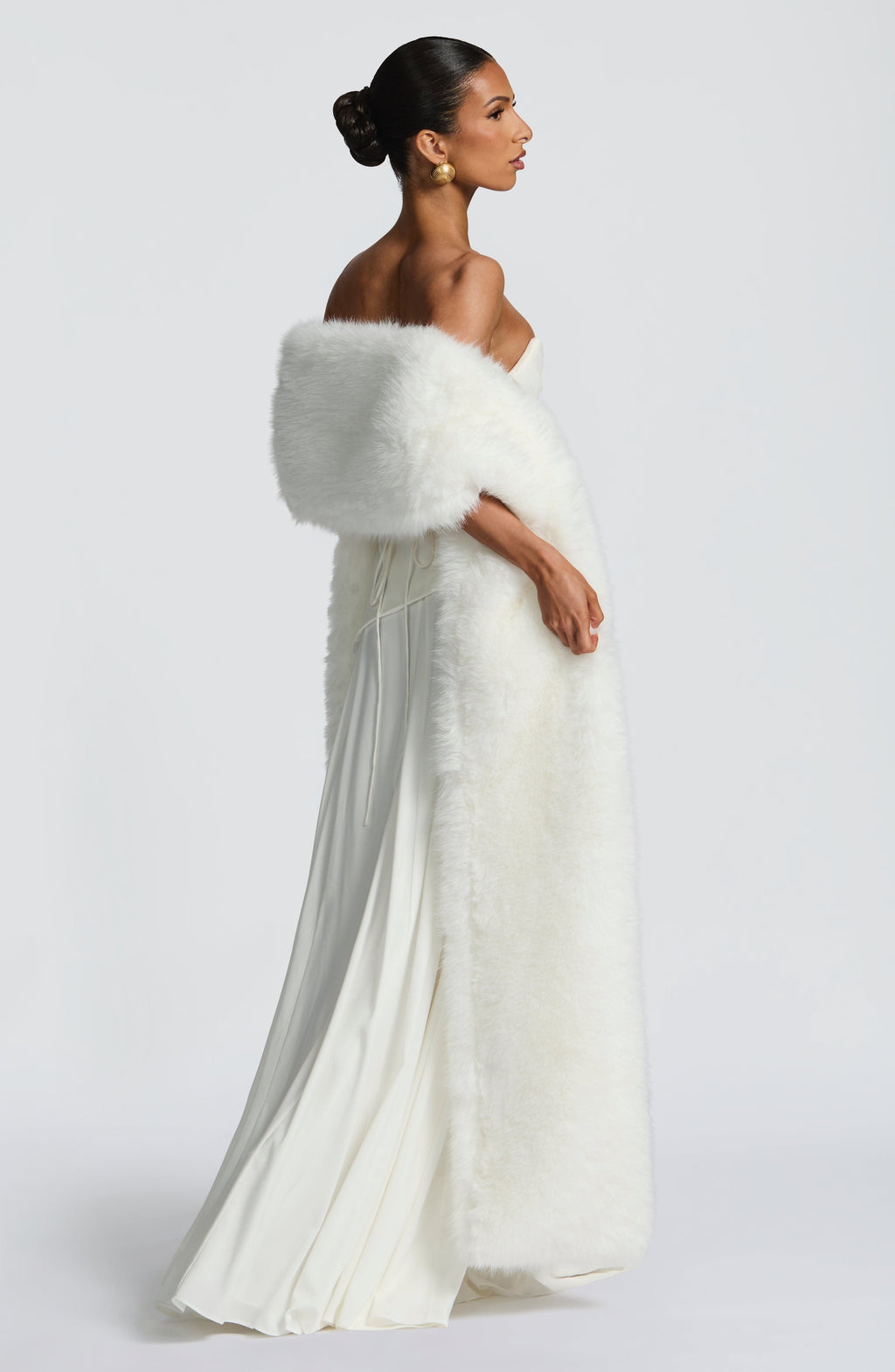 Elevate your ensemble with the Lulu Shawl in Ivory. Crafted from luxurious plush faux fur, this elegant shawl adds a bold and refined touch to any outfit. Perfect for layering, it enhances your look with soft texture and timeless sophistication.