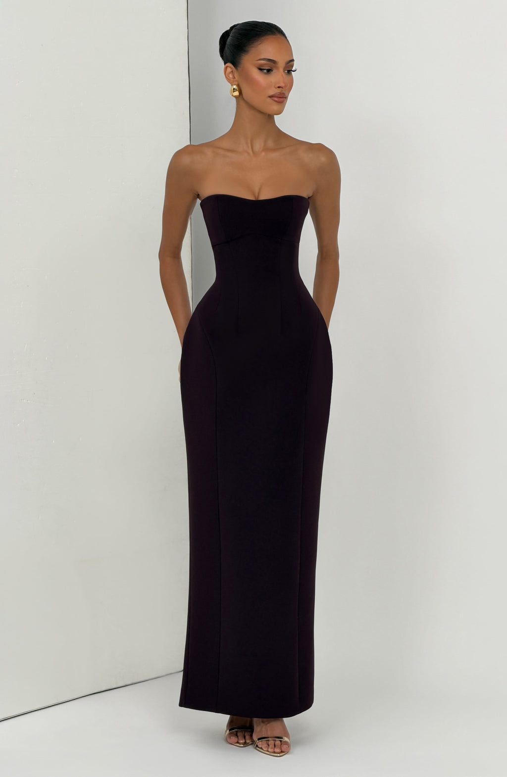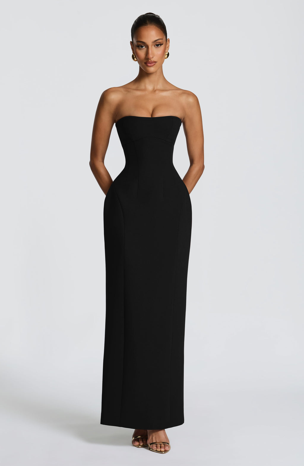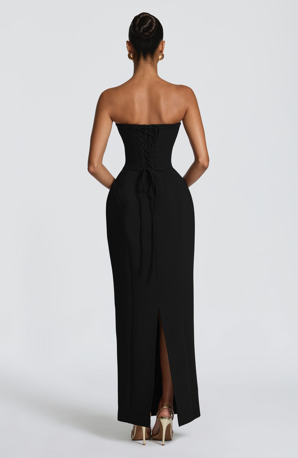 Manon Maxi Dress in structured black crepe with a strapless sweetheart neckline and corsetted bodice. Lace-up back overlay cinches the waist while the column skirt creates an exaggerated hourglass silhouette. Centre back split for movement and drama.