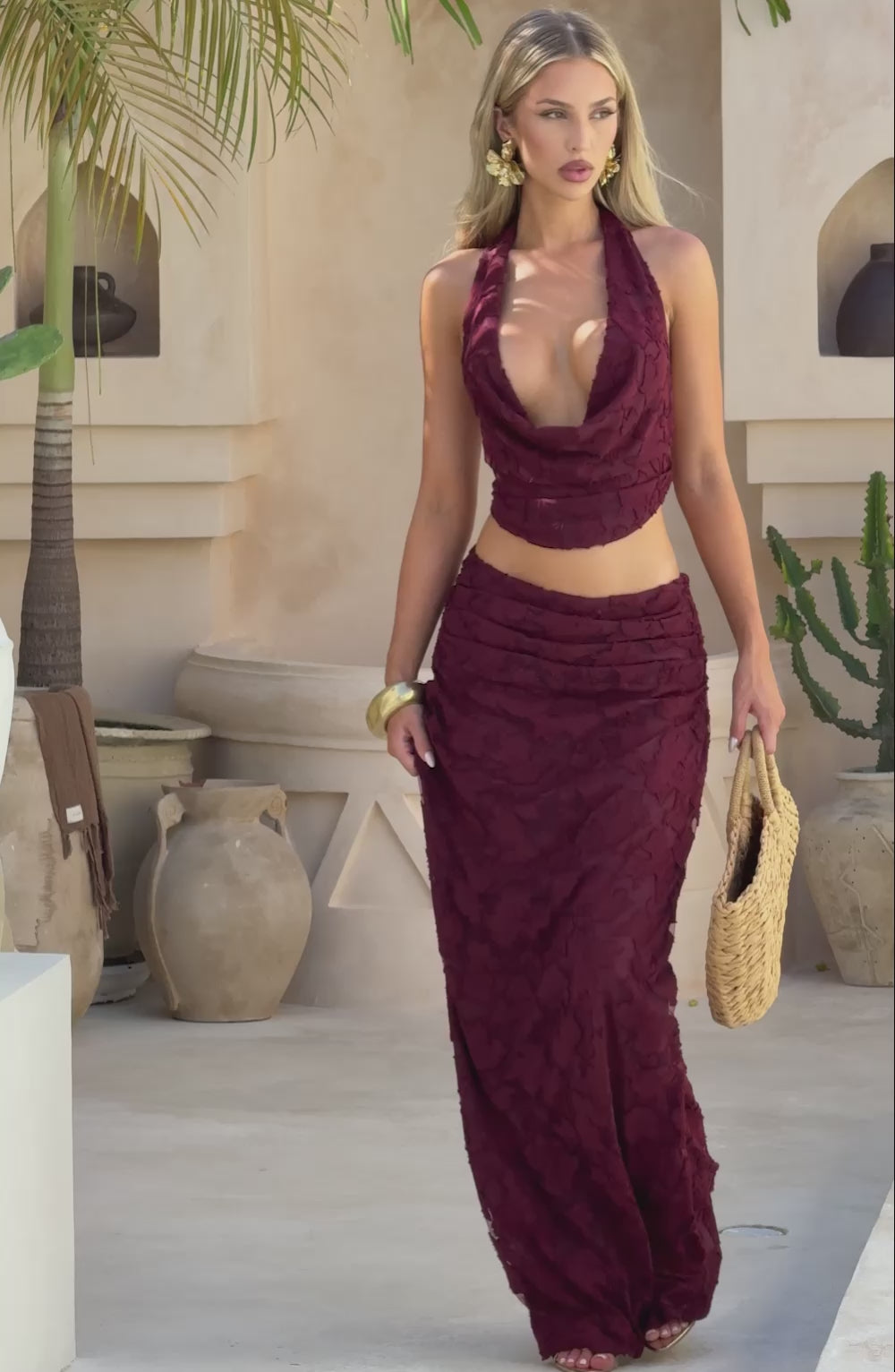 Indulge in the luxurious Myra Maxi Skirt in Cherry Lacquer. The maxi length, floral burnout jersey fabric, and mid-rise waist create an elegant and exclusive silhouette. Pleat detailing on the front and back adds a touch of sophistication to this column-shaped skirt. Pair it with the Myra Top for a complete, high-end look.
