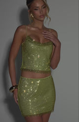 The Nora Top in olive features a sophisticated cowl neckline and cropped length, crafted from stretch net lined with mesh for a delicate fit. Embellished with square hotfix rhinestones and finished with elasticated shoulder straps, it offers both elegance and comfort.