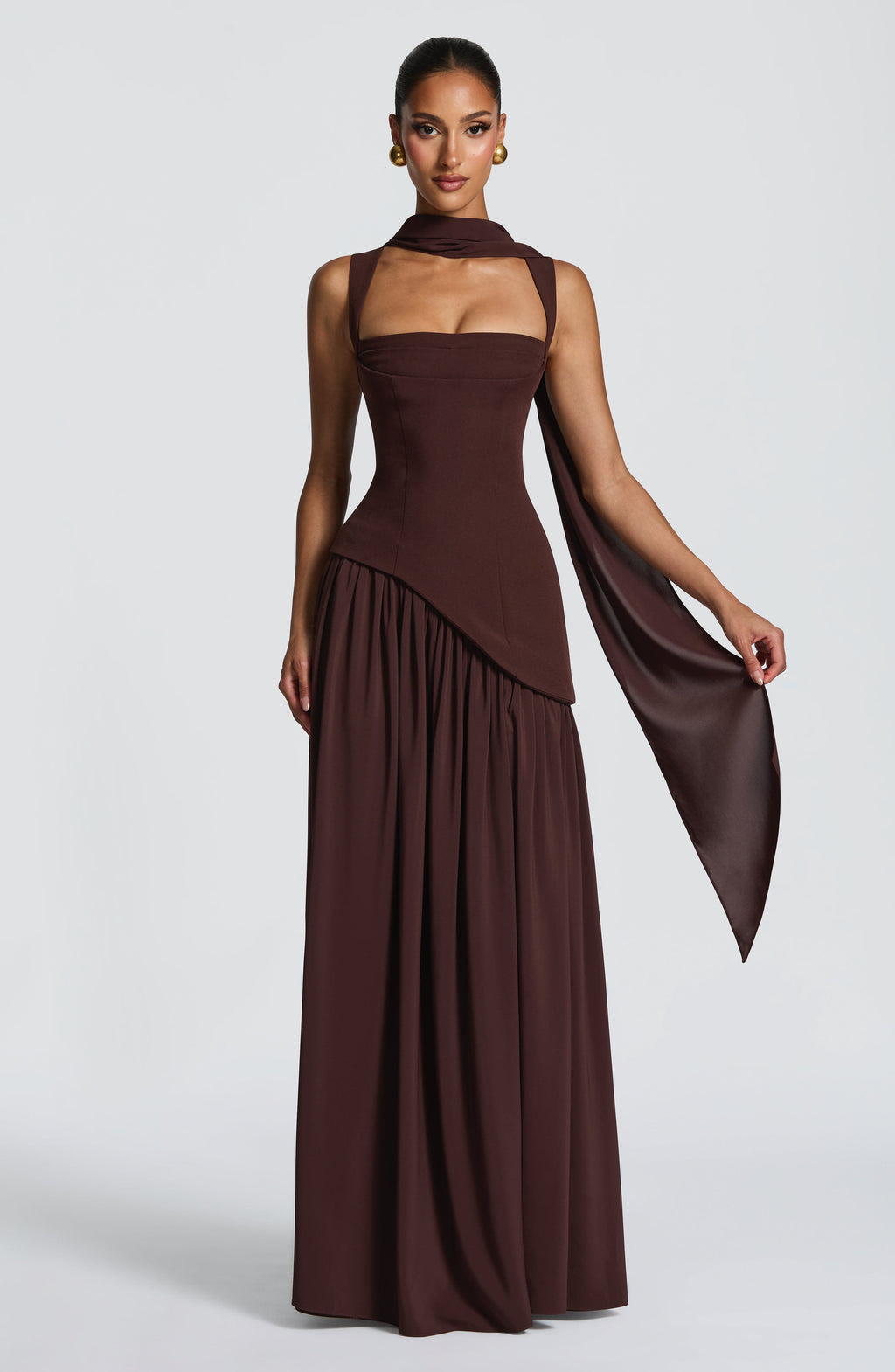 The Tullulah Maxi Dress in Plum Brown combines structured elegance. A non-stretch crepe bodice features a square neckline with pleated bust detail, princess seams, and a lace-up back, while the chiffon skirt flows into a full, gathered silhouette with a thigh-high split. Tapered shoulder straps and an asymmetric curved hem complete this piece.