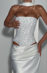 Indulge in luxury with the Yvette Corset in elegant ivory. Crafted from structured satin, this strapless corset boasts a bodice with boning for a flattering shape and a lace-up back for a custom fit. Adorned with multi-shape hotfix rhinestones, it features a corset hem for an undeniable touch of sophistication.